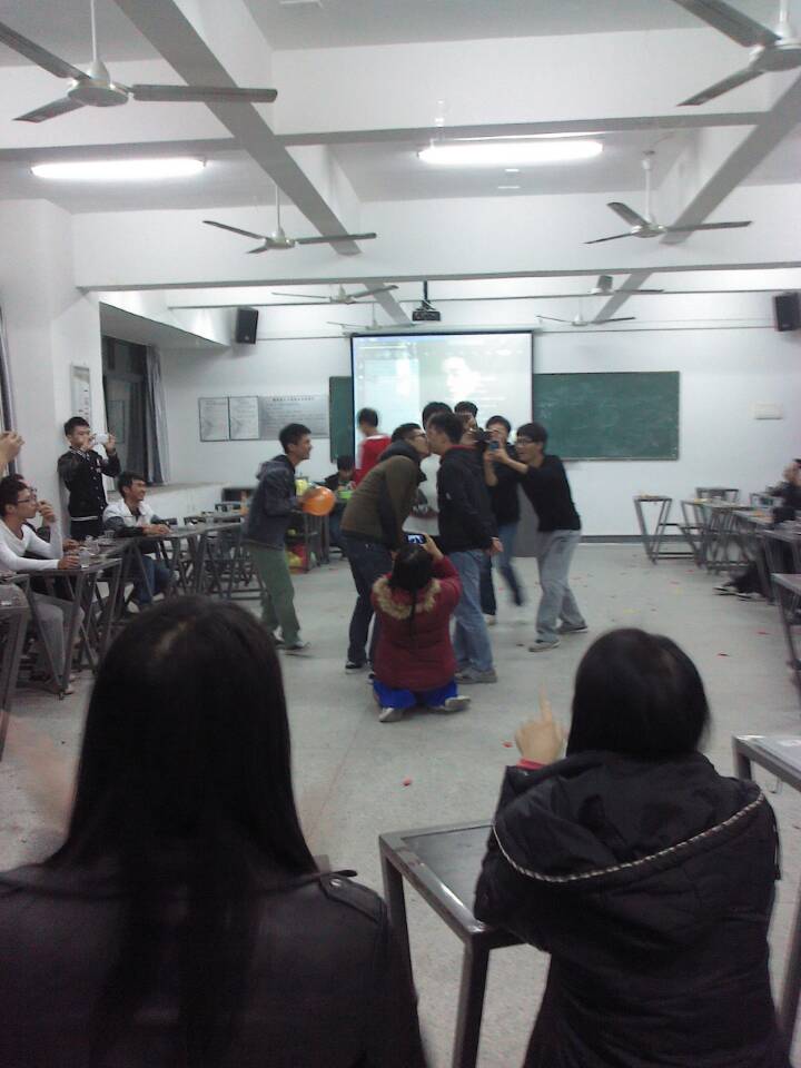 临近12月,温暖的广州终于在这个时候有了一丝冬日寒冷的气息。12日晚上4412的课室却热血沸腾,原来模具1301班的同学正在这举行一场热闹非凡的联谊活动。本次活动较之以往的联谊最大的区别在于本次联谊活动只在自己班级内部进行,而模具1301班全体47名同学全是男生,名符其实的“和尚班”。在活动的前期准备阶段,我还担心如果没有女生参与进来,联谊活动会不会很无聊,难以调动大家的积极性。但到活动现场才发现我的担心多余了,40几位大男孩在课室玩得不亦乐乎,班干部们策划的各种别出心裁的游戏很快就调动了大家的兴趣,几乎所有的同学都主动参与配合主持人的每一个游戏环节,玩累了大家坐下来吃东西,喝饮料,聊天,仿佛在这一刻大男孩们都腿去了以往的羞涩,大家彼此畅所欲言,展露真性情。虽然外面的天气很寒冷,但此刻我们大家的心里是暖洋洋的,我相信模具1301班的同学能够成为相亲相爱的一家人。