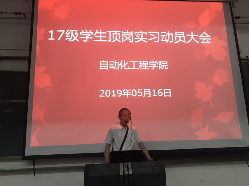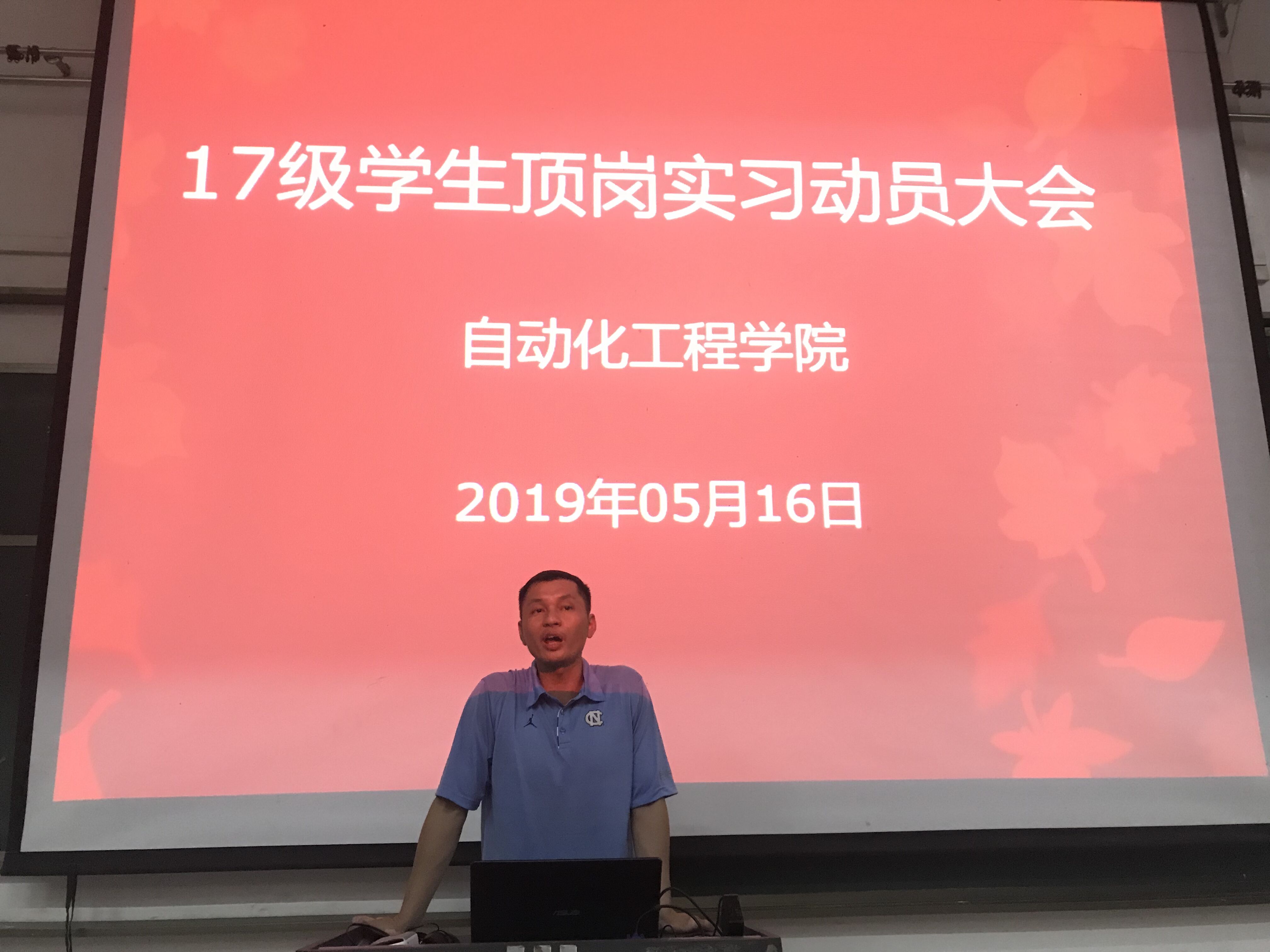 自动化工程学院17级顶岗实习动员大会于2019年05月16日在阶梯二会议室召开。自动化工程学院副院长高立义、党总支副书记吴超作动员发言,本院17级全体学生参加。